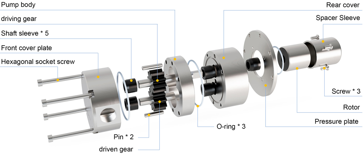 The pump body is made of food grade 316L, and the gear and shaft sleeve are made of modified high-strength PEEK. The gear pump adopts an "O" ring seal as a whole, with an overall pressure resistance of over 3MPA. The internal and external magnets adopt a dual magnetic tile design, greatly increasing the magnetic torque of the magnetic coupling. Some products can have a pressure difference of over 4MPa (it is recommended to use below 2MPa, as working with a pressure difference of over 2MPa will reduce the service life of the pump). It is suitable for most solvents, acids and bases, organic halides, hydrocarbons, organic nitrides, inorganic reagents, etc.